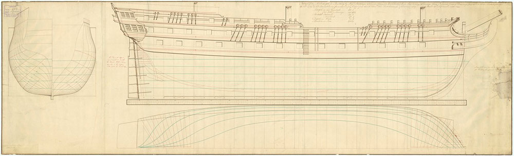 Henry Adams launched Thames at Buckler’s Hard on 10th April 1758. Unusually, she was built largely of imported oak and Adams himself had to provide masts, yards, furniture and stores. This was probably because the strains of war against France were beginning to tell on the Royal dockyards. Thames enjoyed a long career, seeing service in the Seven Years’ War, the War of American Independence and the Revolutionary Wars against France, until, in 1793, she was captured by the French en route to Gibraltar. She then served in the French Navy as the Tamise.